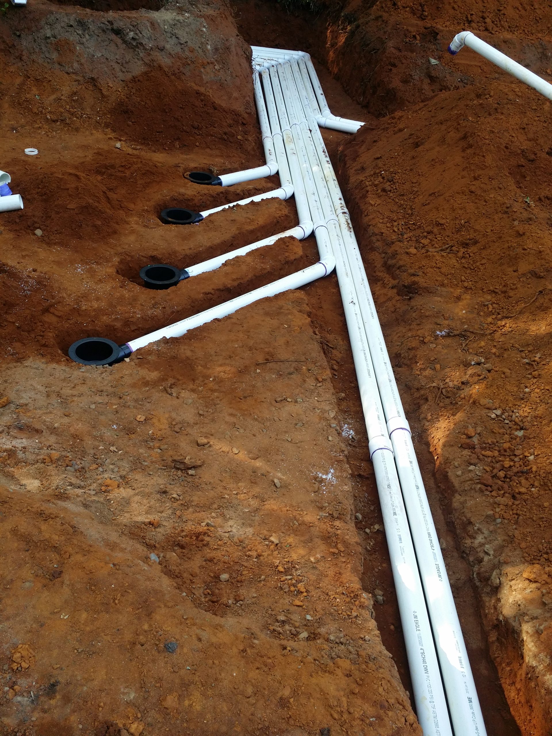 I always install bottom drains and gravity fed filter systems in all of my ponds.  So, once the hole is dug, I need to install all of the PVC pipes for the bottom drains to the filter tanks, and set skimmers before putting in my liner.  For more information on gravity fed filter systems, see the slider at the top of the front page of this website, and scroll to the page on filtration.