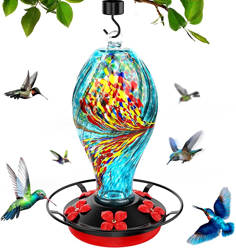 A beautiful blown glass feeder to add some art into your garden. There are a few different colors to choose from. The included hanger has an ant moat to keep the ants off of the feeder. I like the red color on the base and flower feeder holes, this color helps to attract more hummingbirds! It is also easy to take apart and clean.