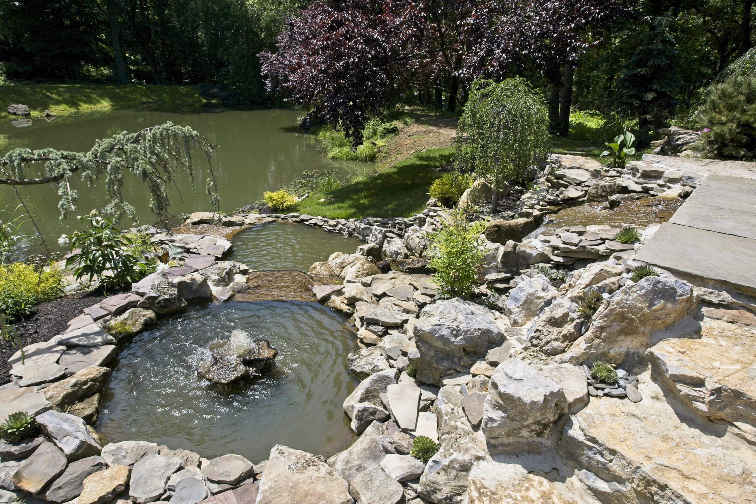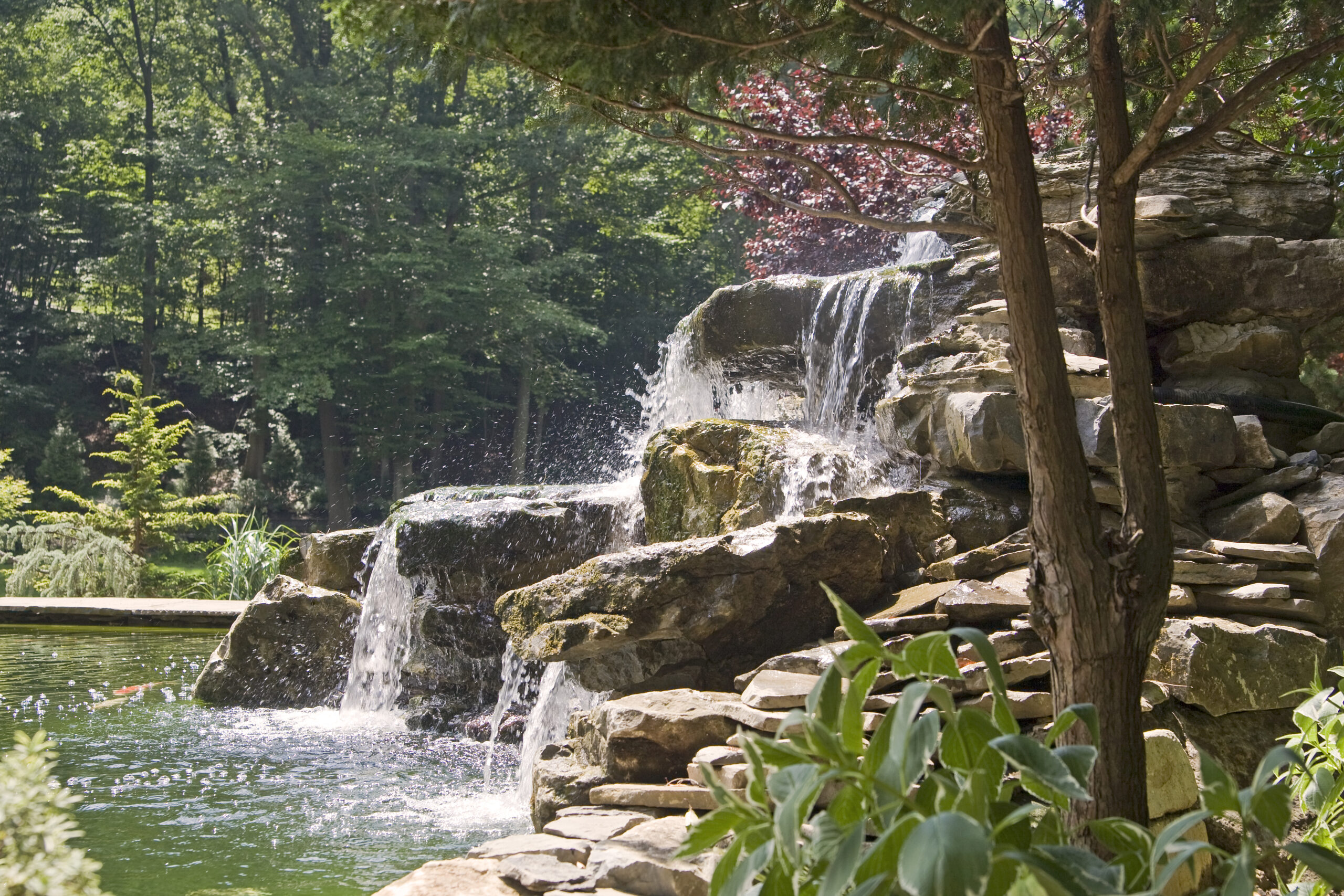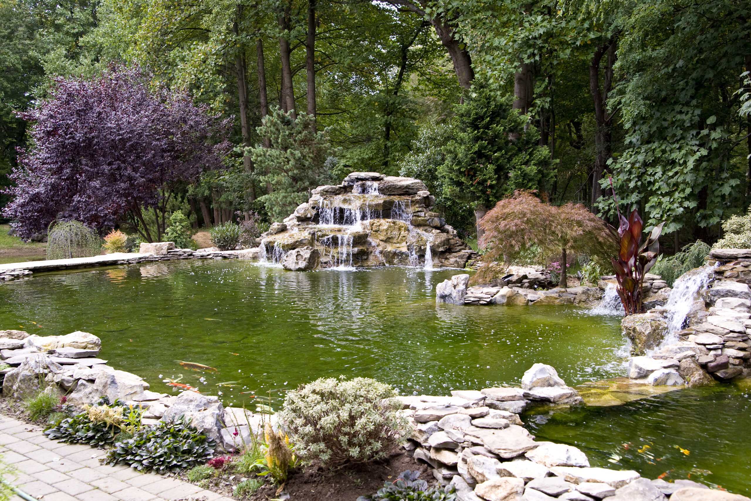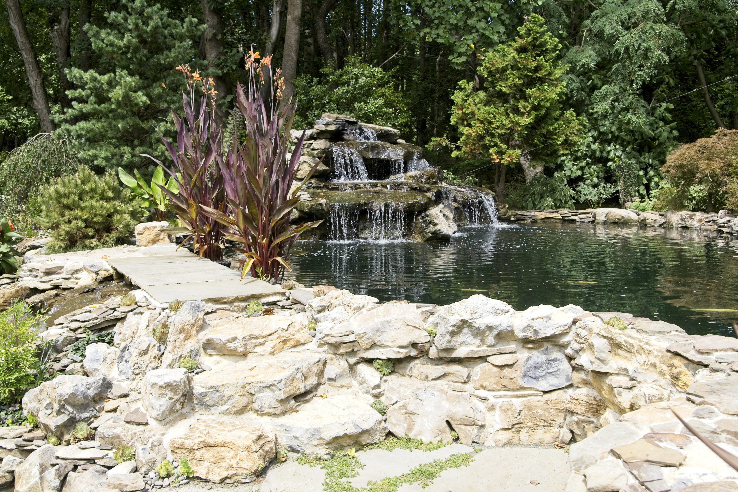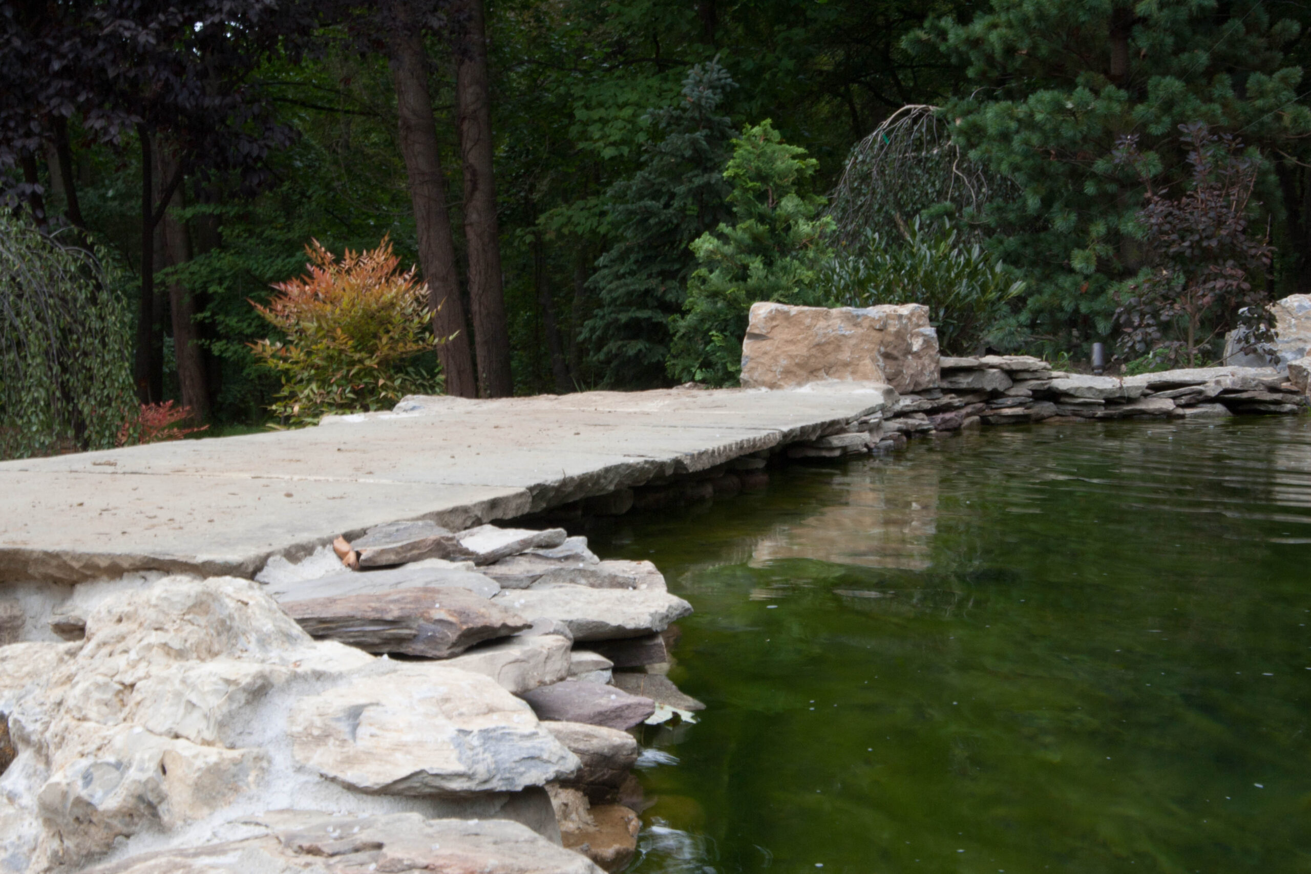 The waterfall at the front end of the pond (closer to the house), is appearing to connect the koi pond on the top of it to the natural pond at the bottom. However, they are divided underneath a bluestone bridge. This waterfall is using the water from the natural pond, and we don’t want to mix that with the water that is filtered in the koi pond. So, a divider is separating them under the bridge. It is designed however to appear that the water from the koi pond is flowing under the bridge and down the waterfall!