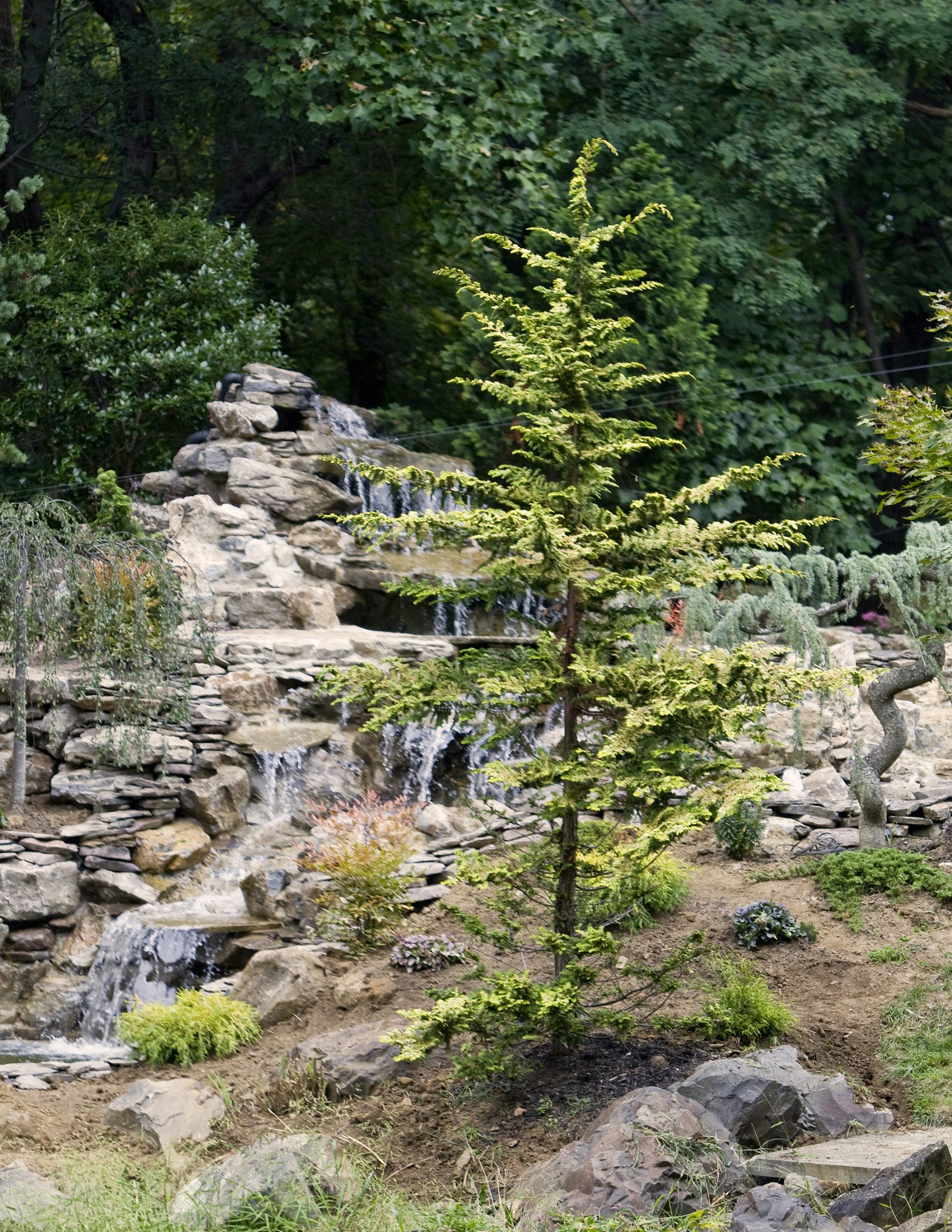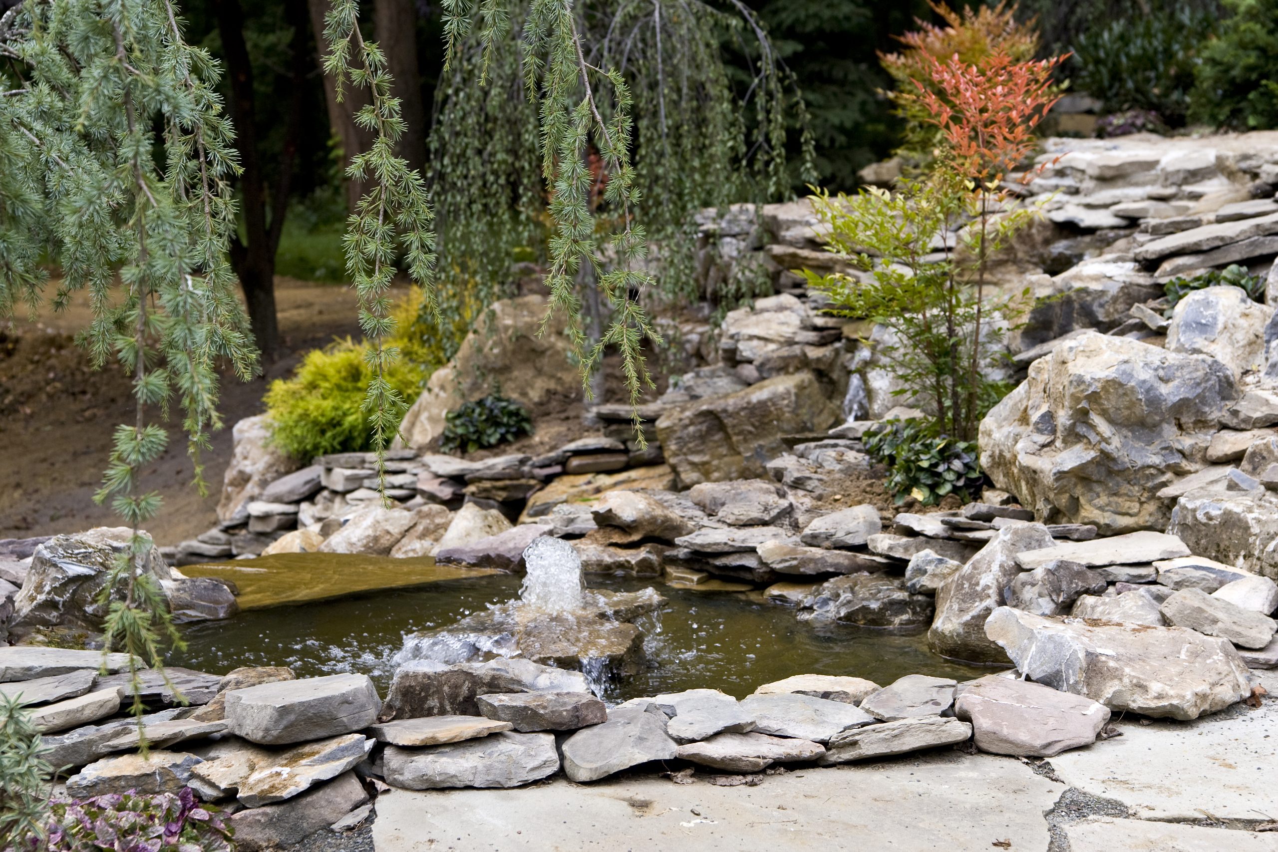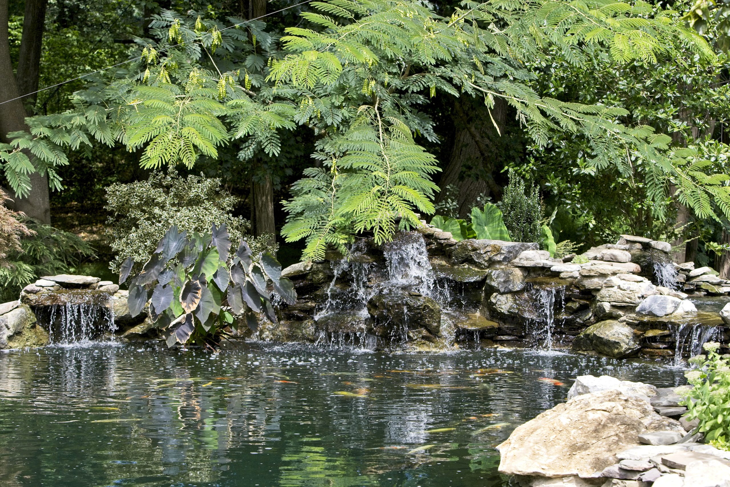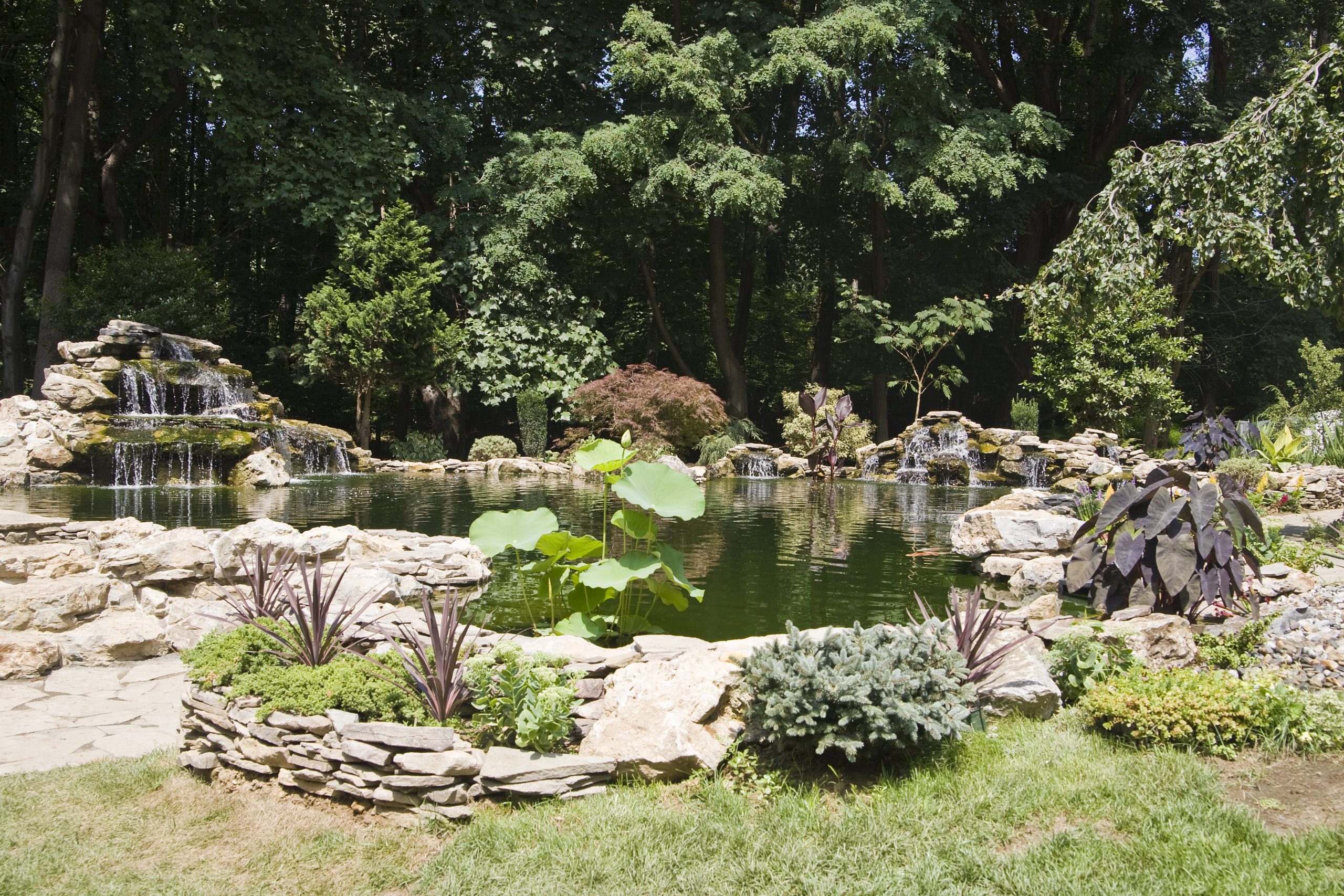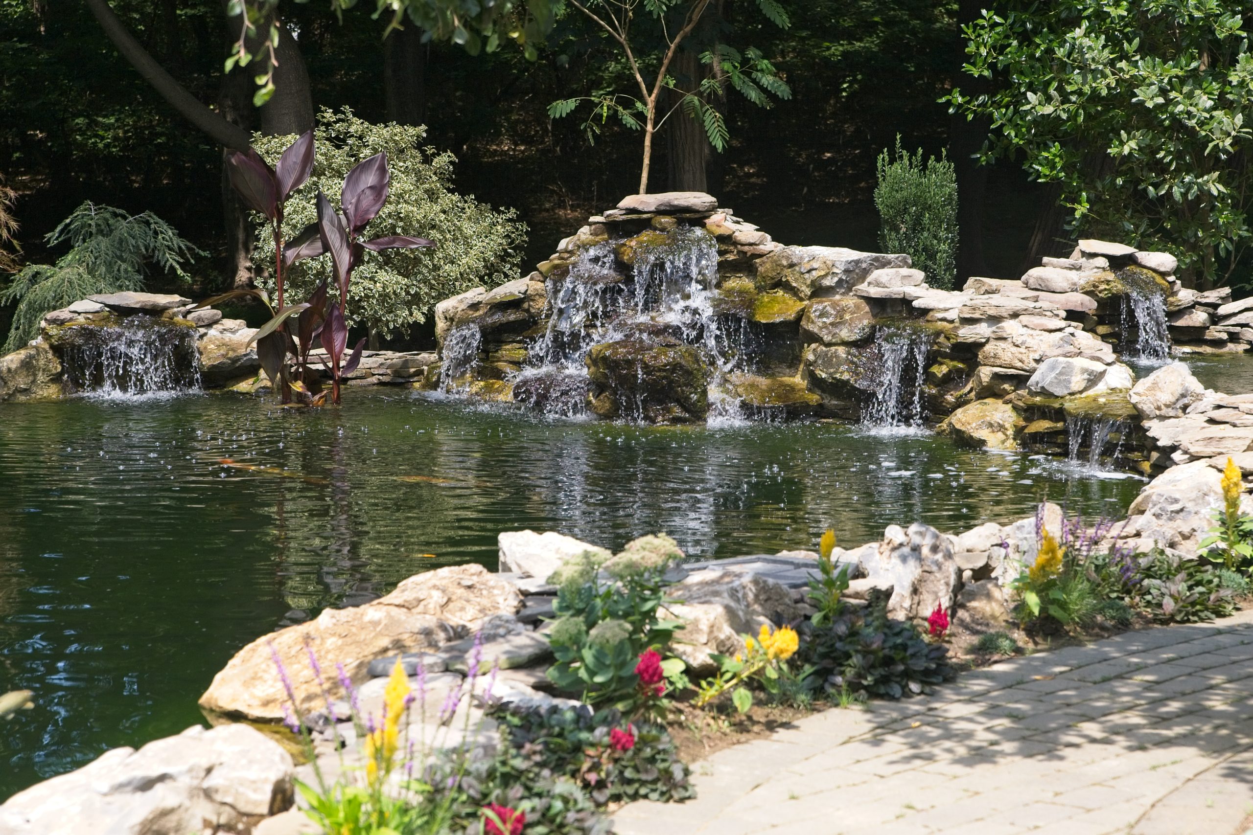 The waterfall at the front end of the pond (closer to the house), is appearing to connect the koi pond on the top of it to the natural pond at the bottom. However, they are divided underneath a bluestone bridge. This waterfall is using the water from the natural pond, and we don’t want to mix that with the water that is filtered in the koi pond. So, a divider is separating them under the bridge. It is designed however to appear that the water from the koi pond is flowing under the bridge and down the waterfall!