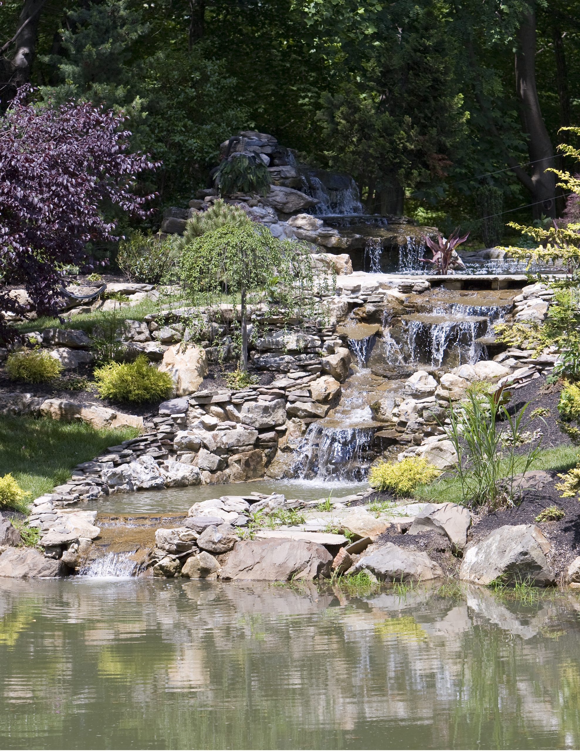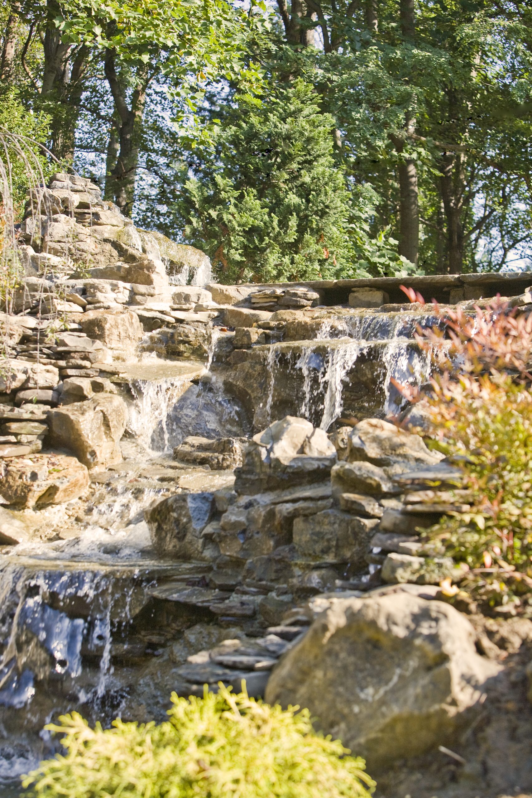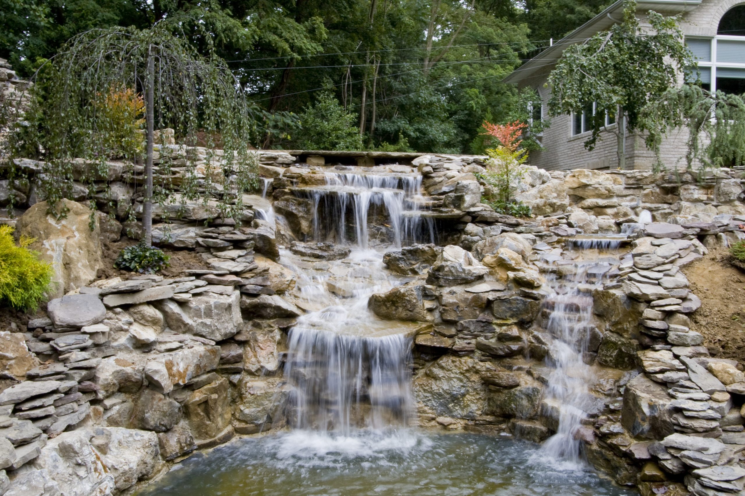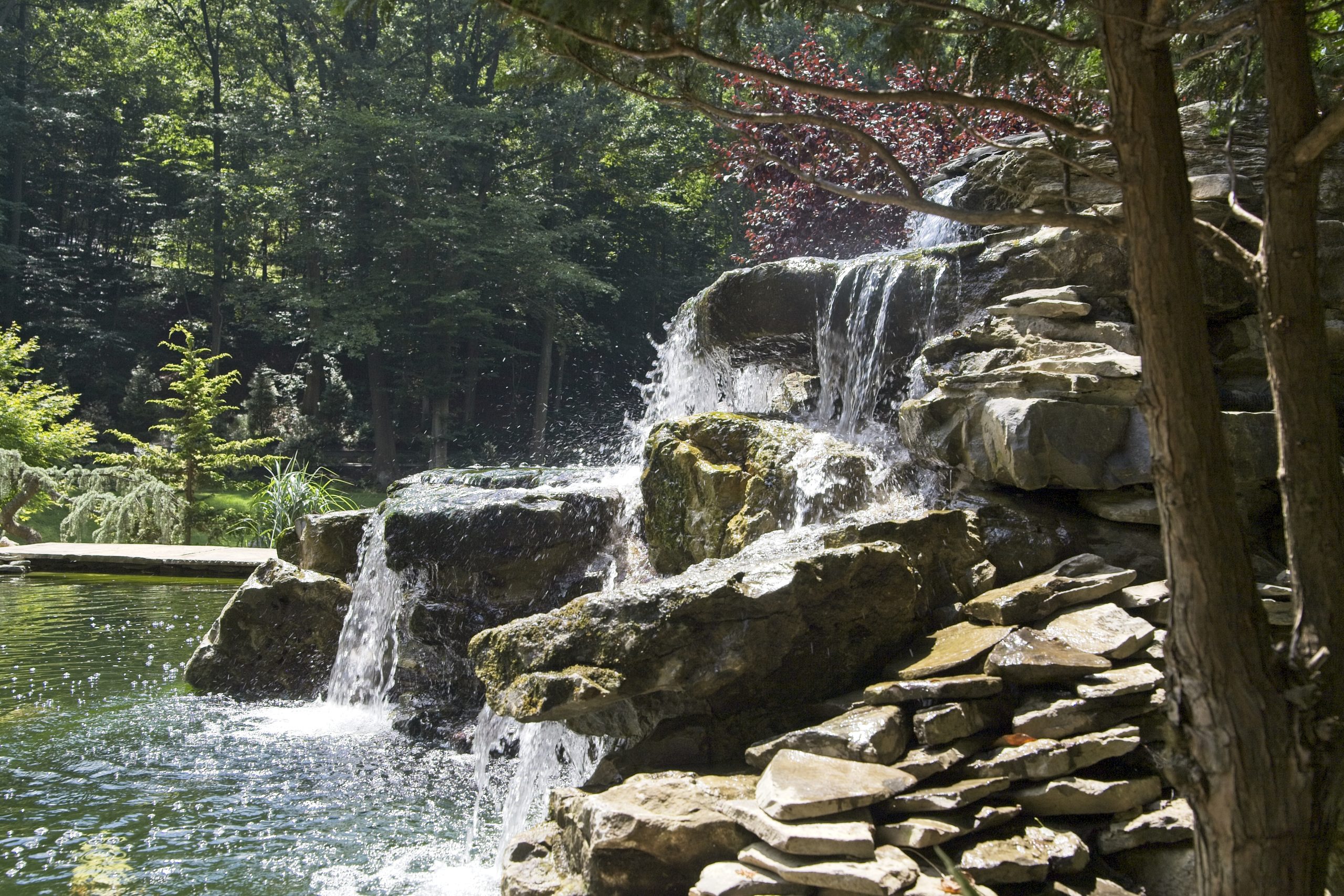 There is a separate pump running this waterfall. It has a large suction strainer in the pond, and it returns out three pipes under the bridge. The pump is 9,500 gph. This waterfall is in full view as you drive down the driveway approaching the house.