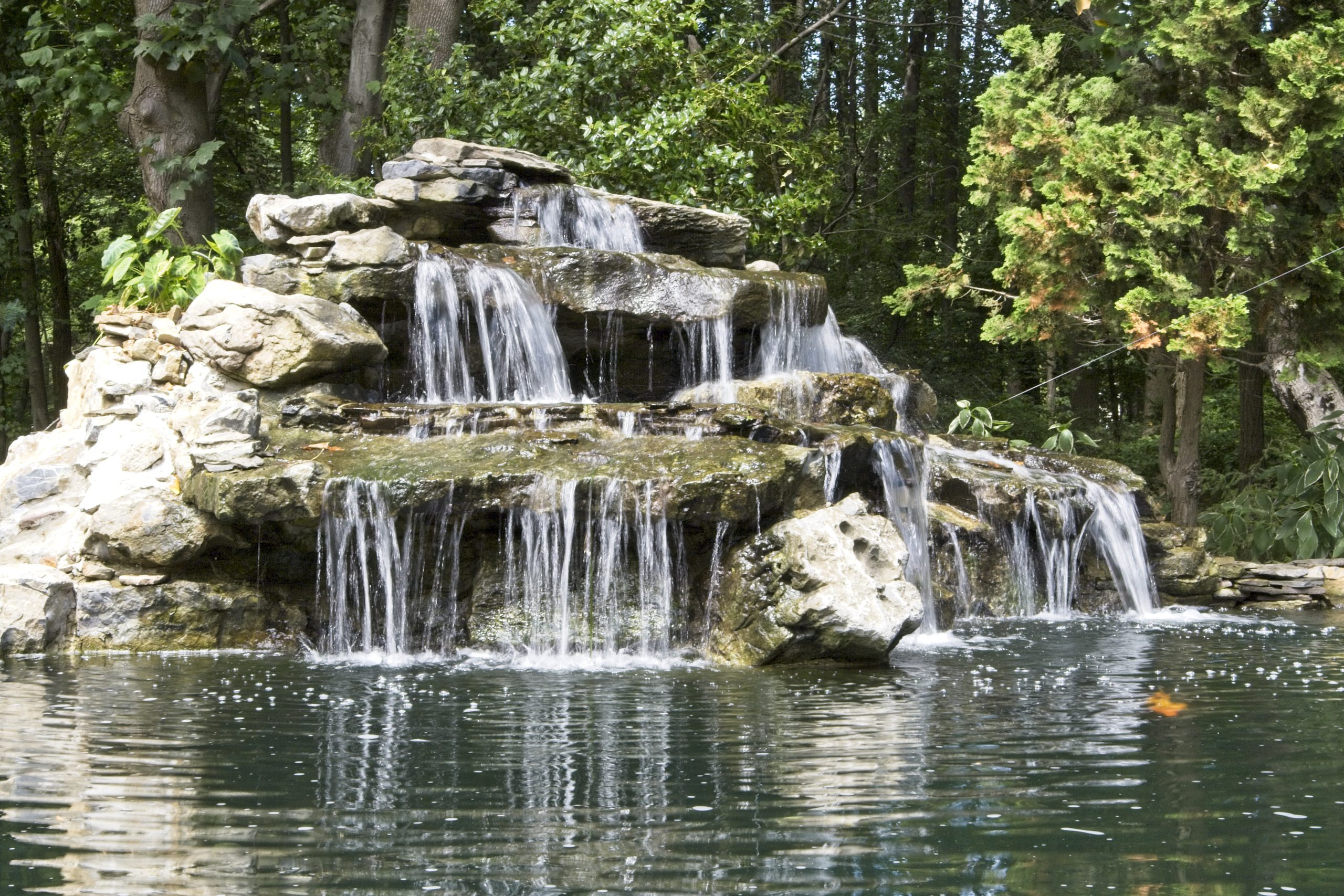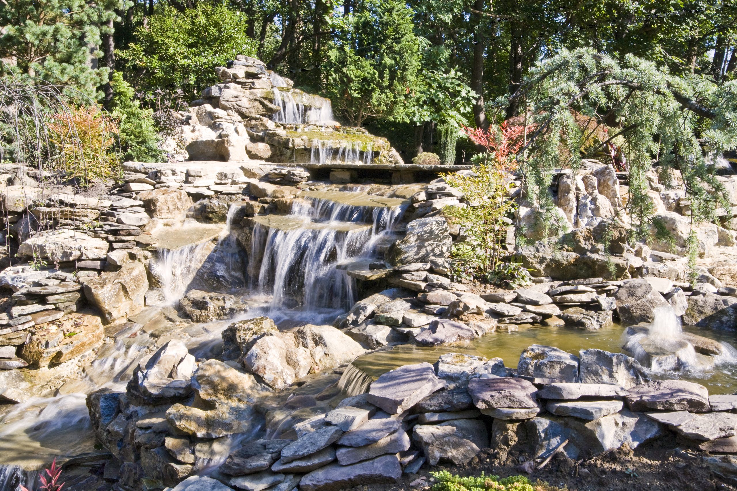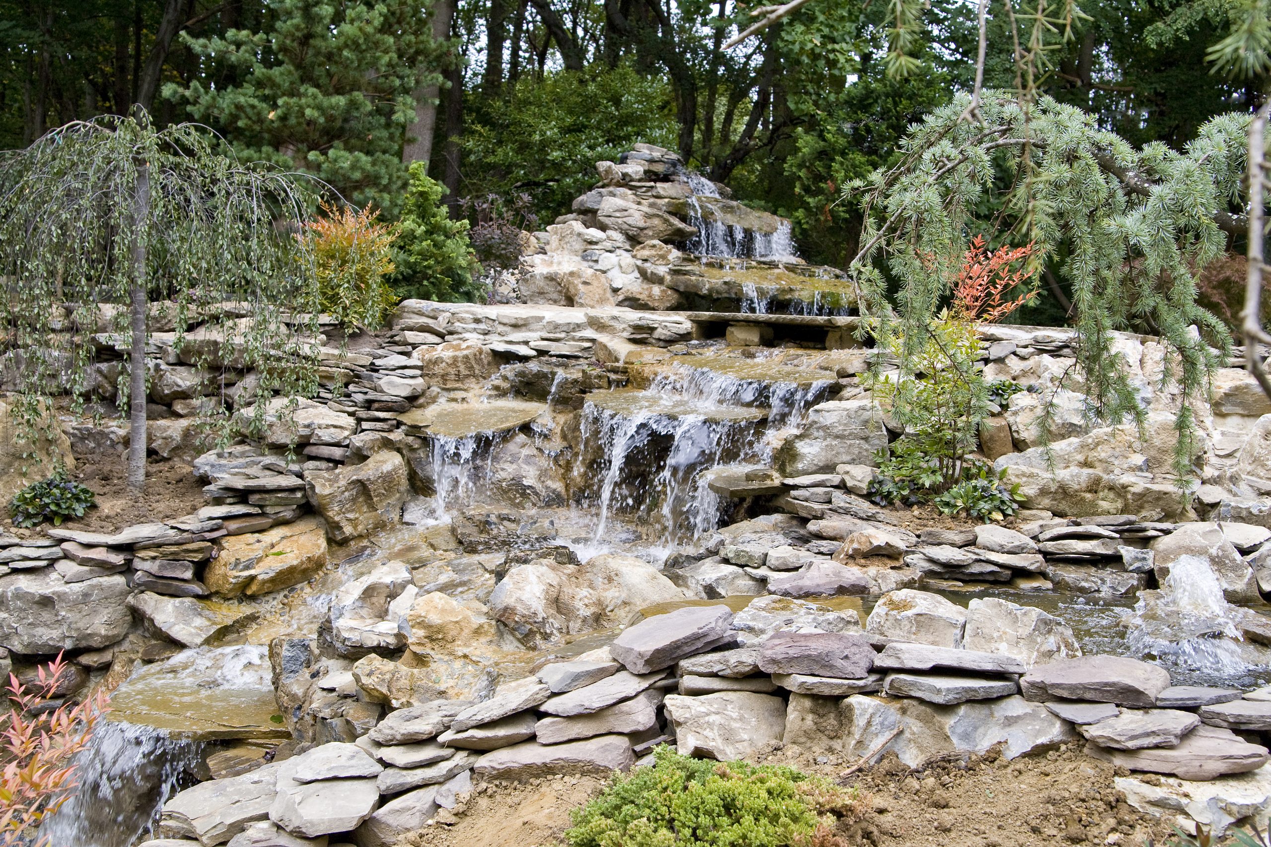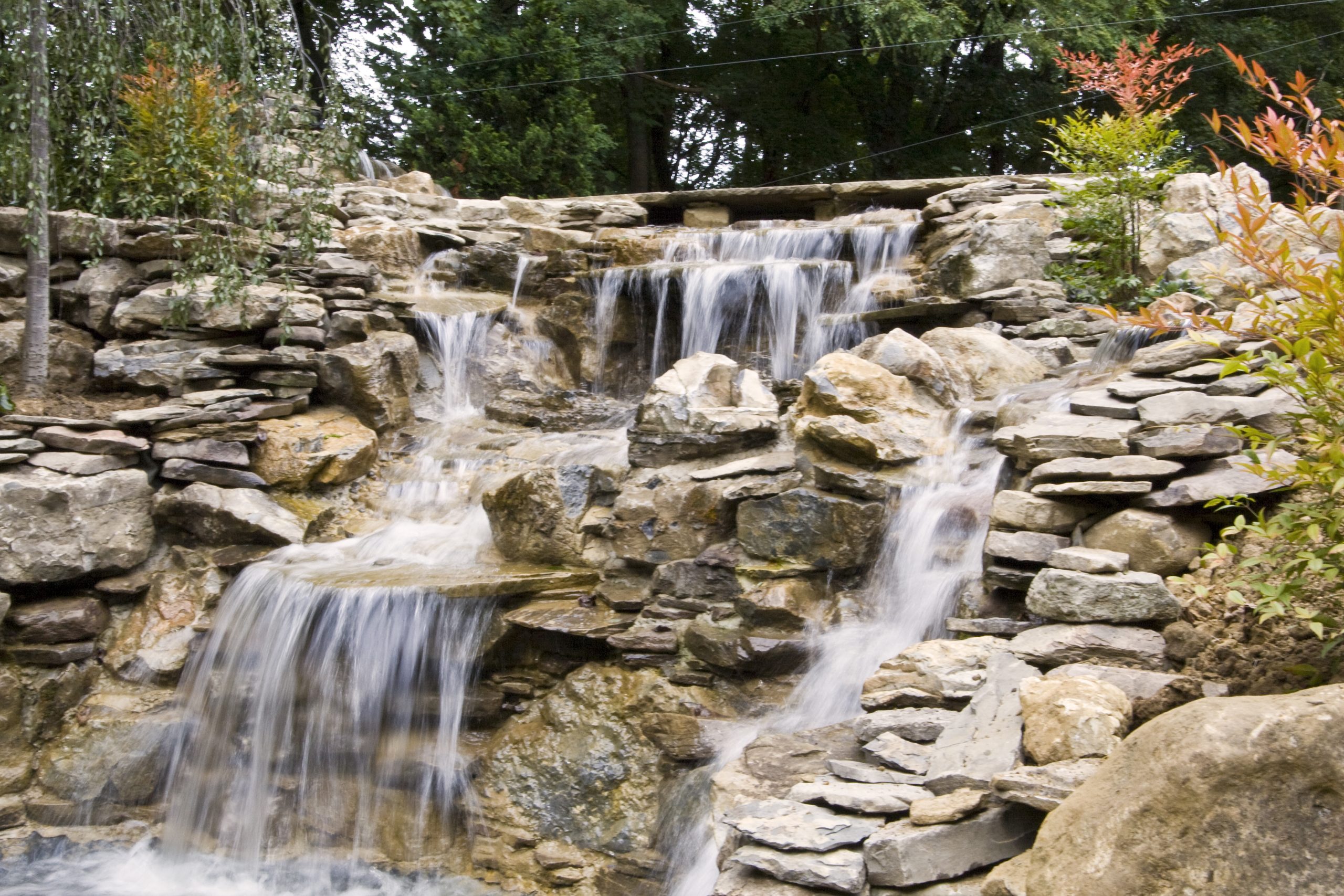 There is a separate pump running this waterfall. It has a large suction strainer in the pond, and it returns out three pipes under the bridge. The pump is 9,500 gph. This waterfall is in full view as you drive down the driveway approaching the house.