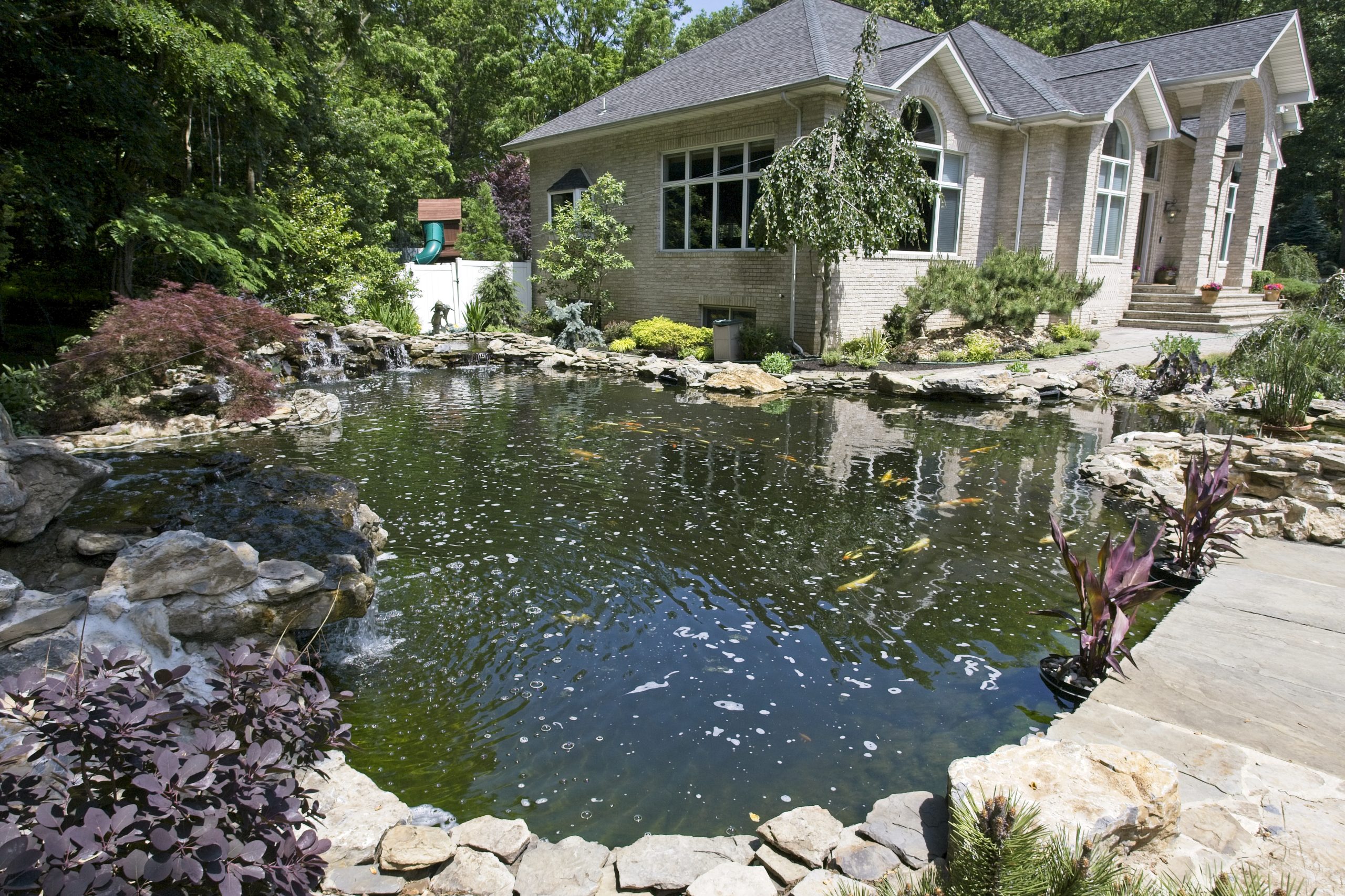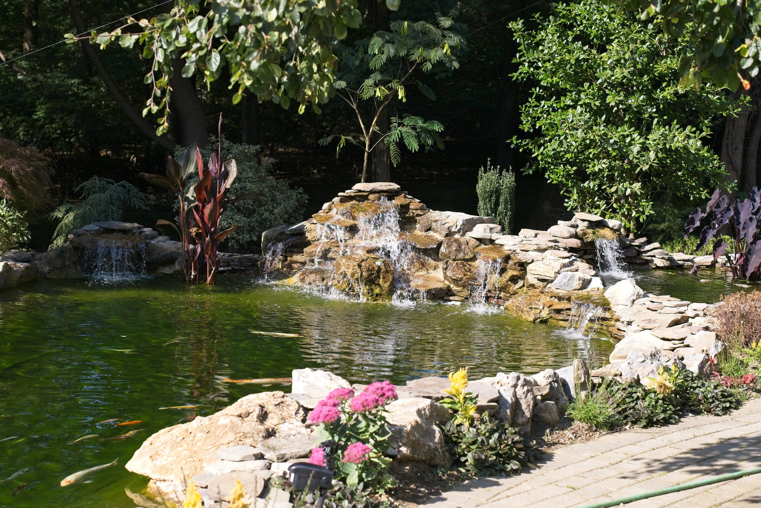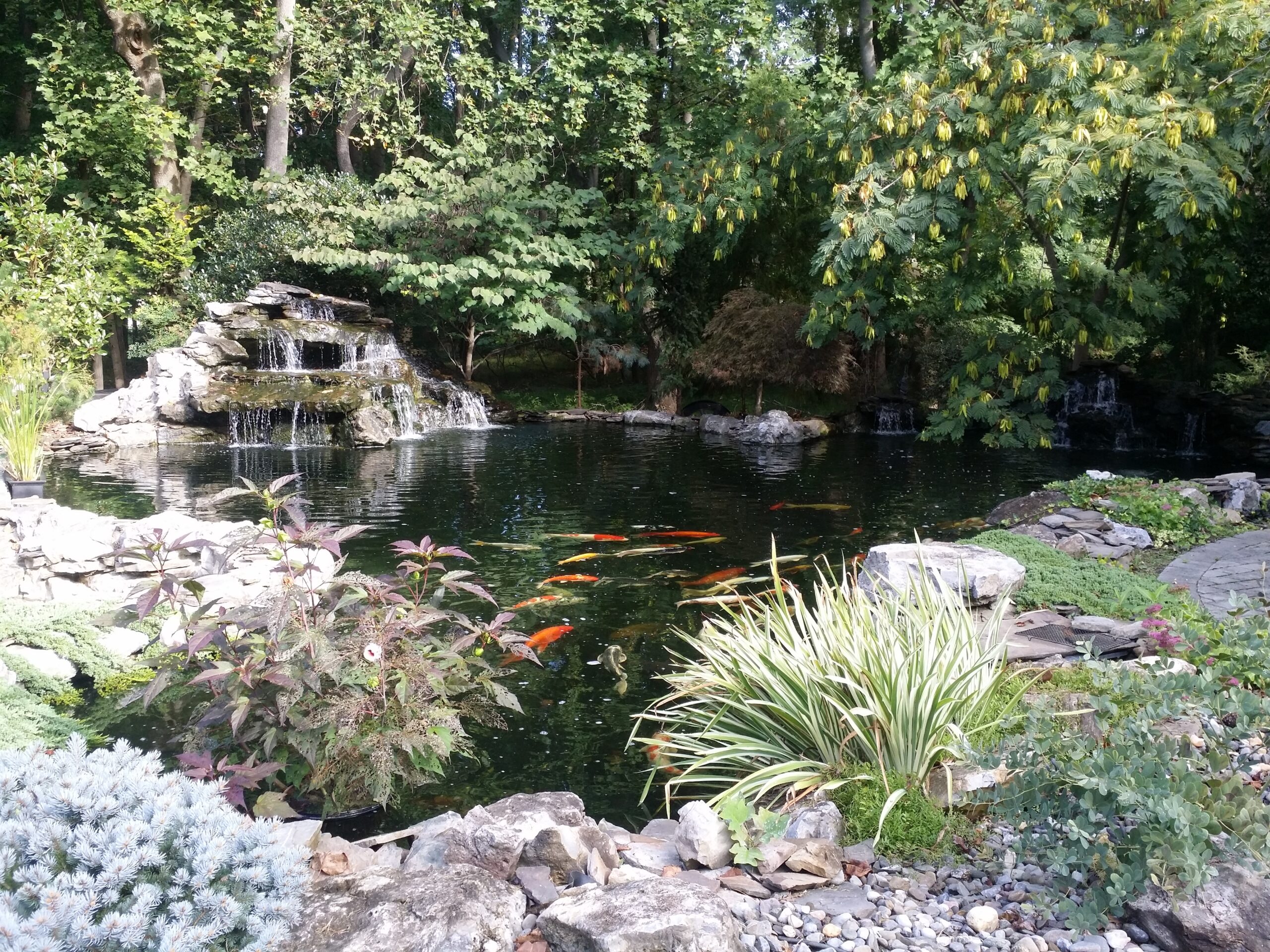 The koi pond has four 4″ bottom drains, and Two large skimmers each with two 4″ pipes all gravity fed into four filter tanks back behind the left side of the large waterfall. Two 13,000 gallon per hour pumps return the water through two 150 watt high output UV sterilizers, a 30,000 gallon 3″ side mounted bead filter, four mid -water returns and the two waterfalls. There are roughly 50 large koi swimming around and they are always looking to be fed.