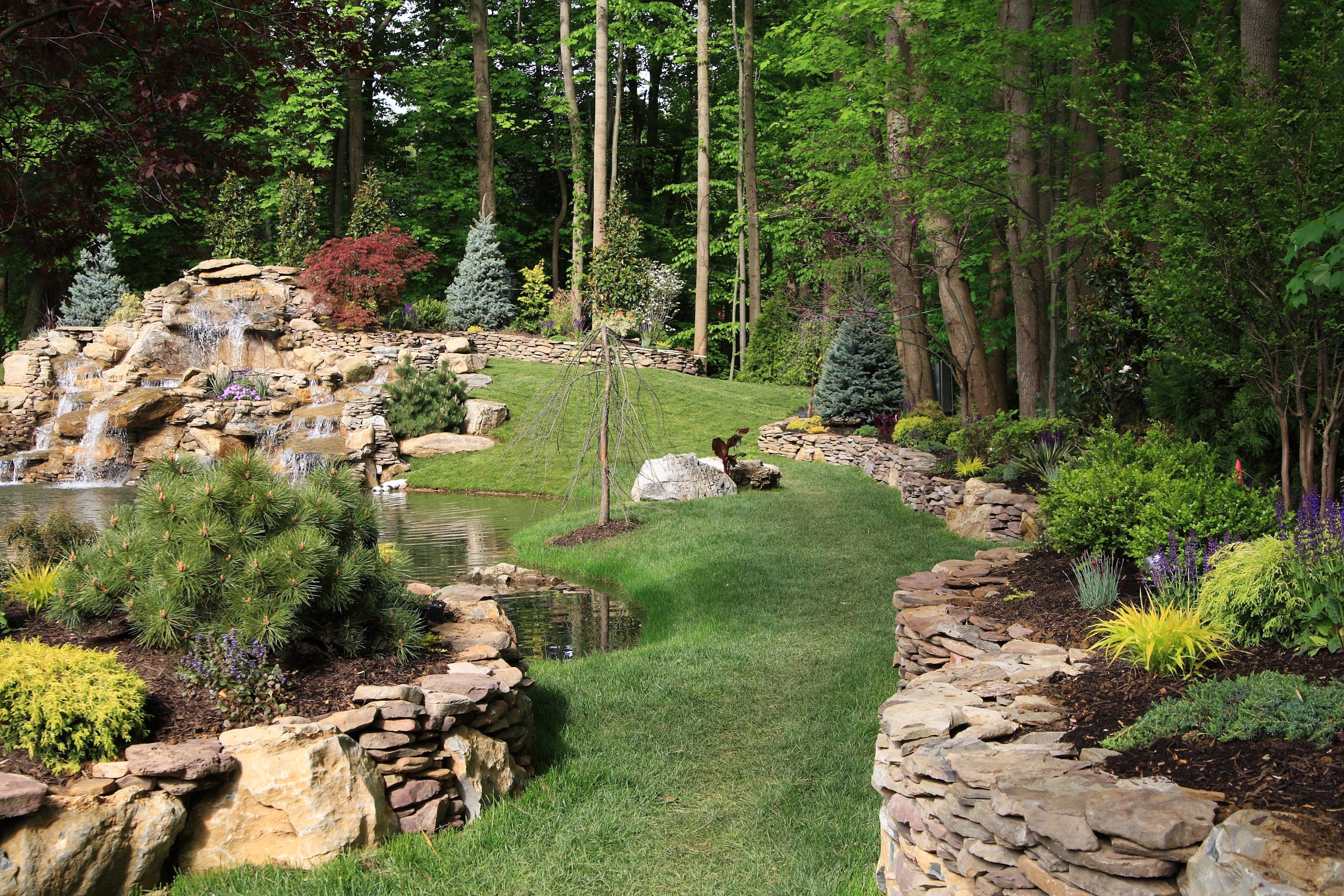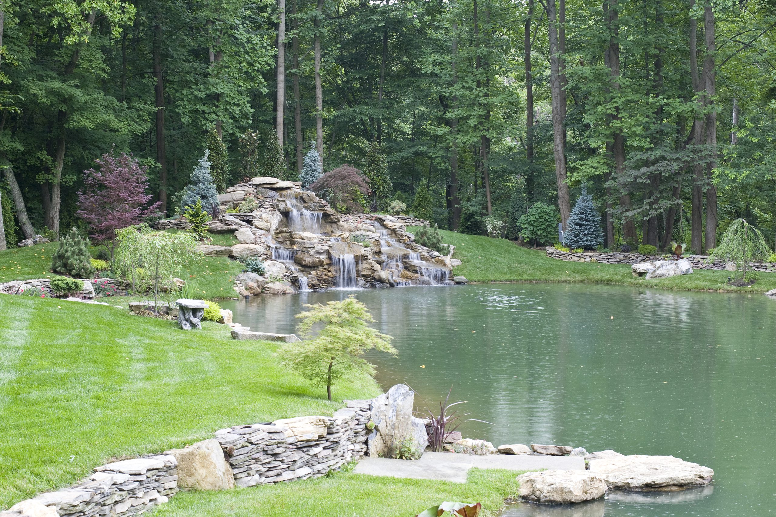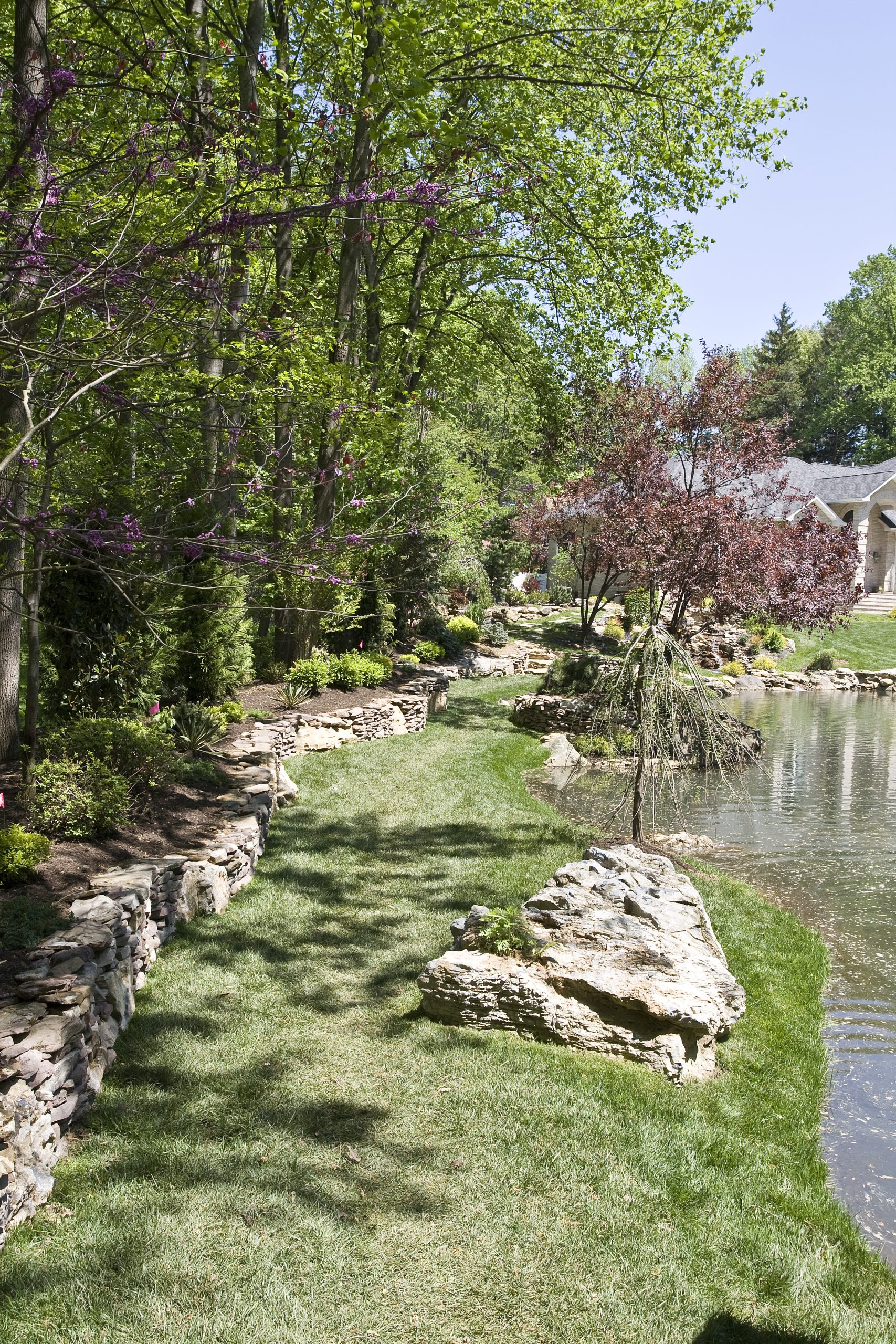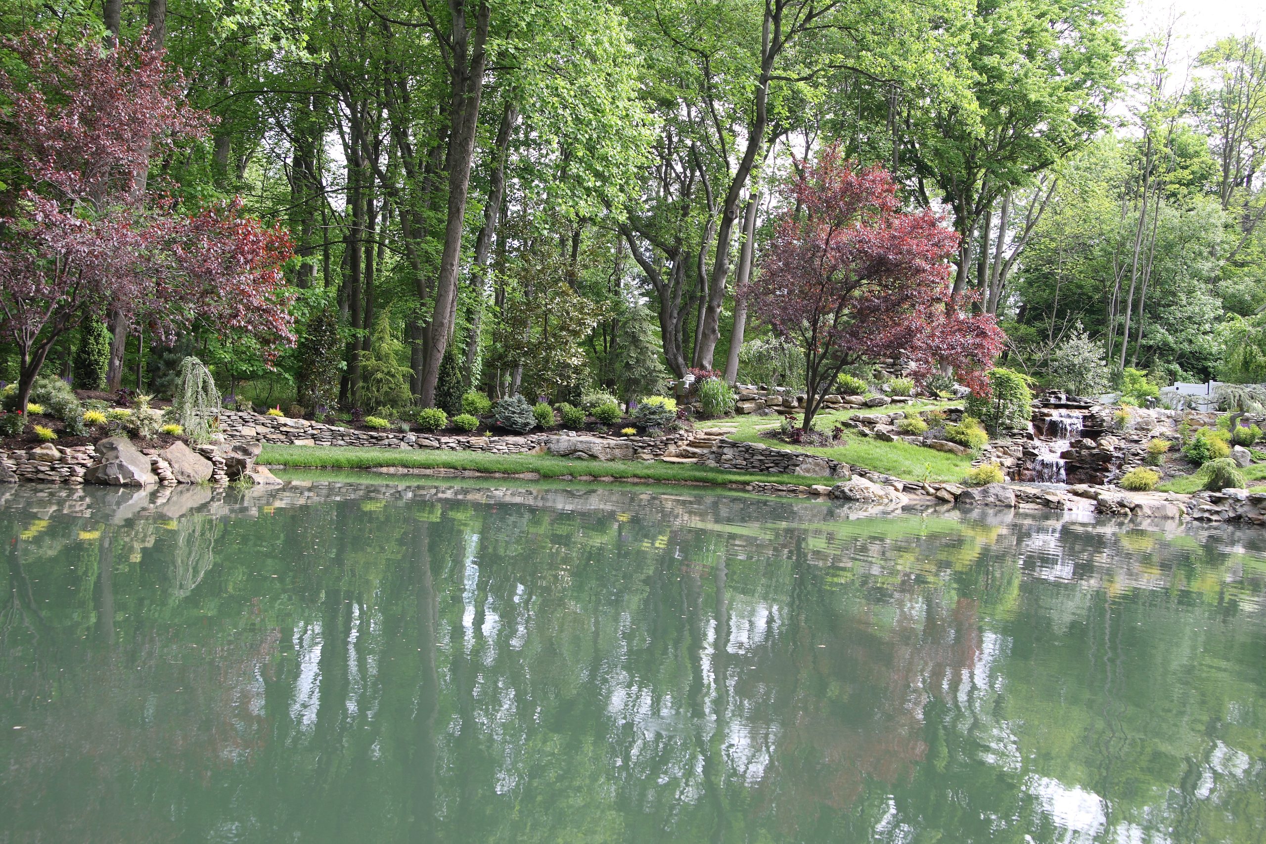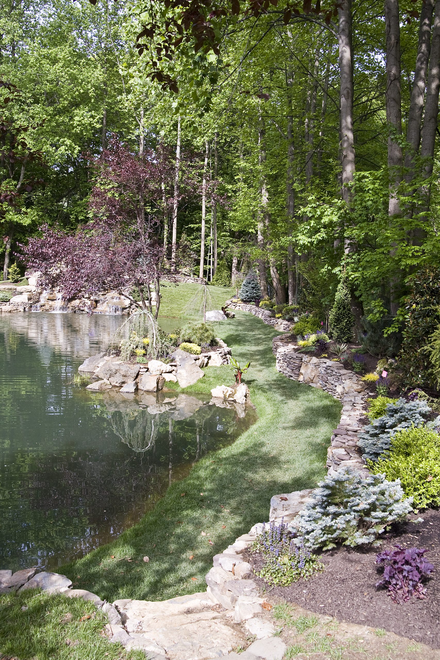 Along the left side of this photo, the side facing the lake, I built a retaining wall out of cement, moss rock and field stone. Turned it into a feeding area, built a stone staircase that leads to a bluestone bridge that crosses over the top of a waterfall that leads down to the natural pond.