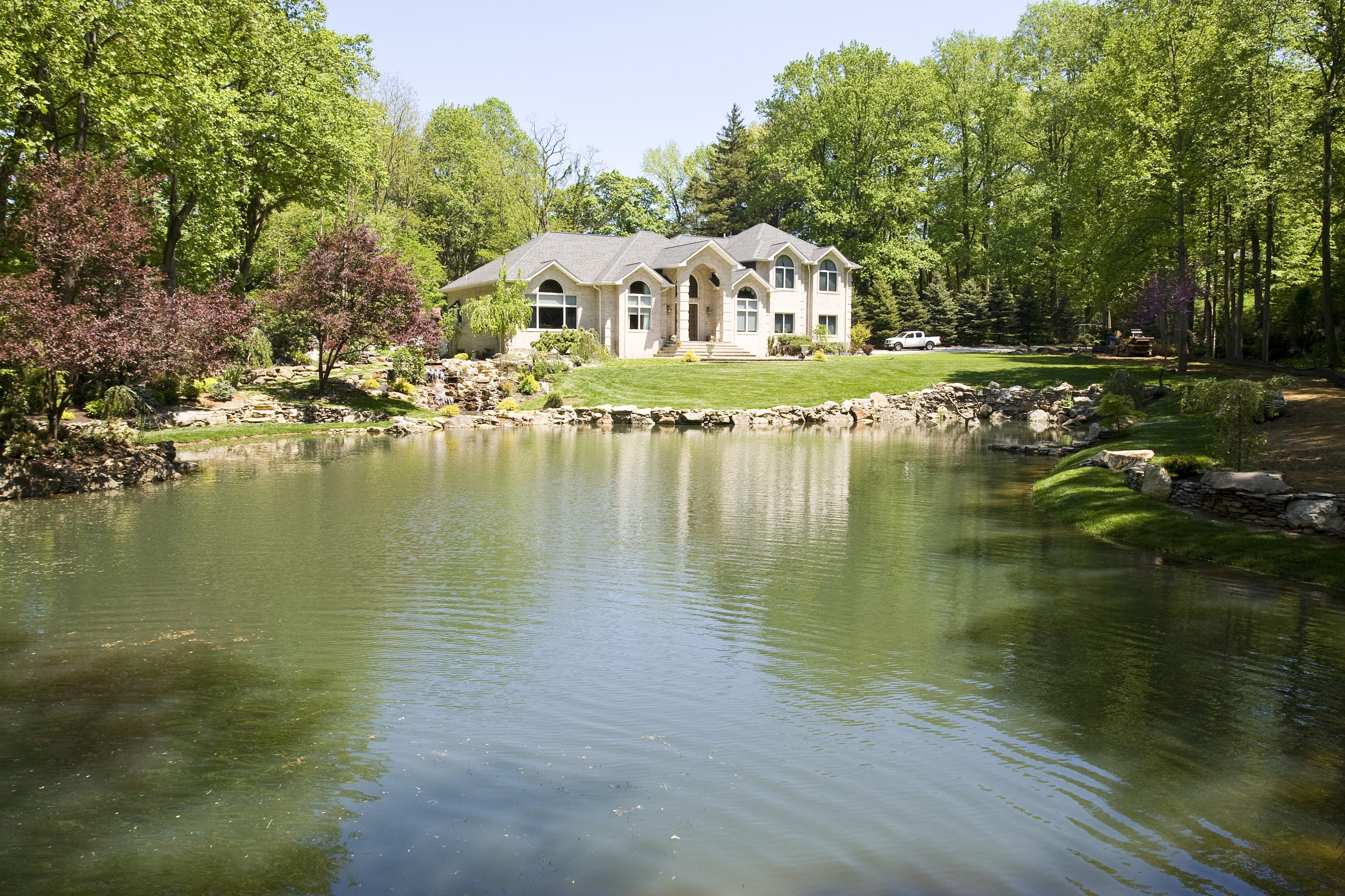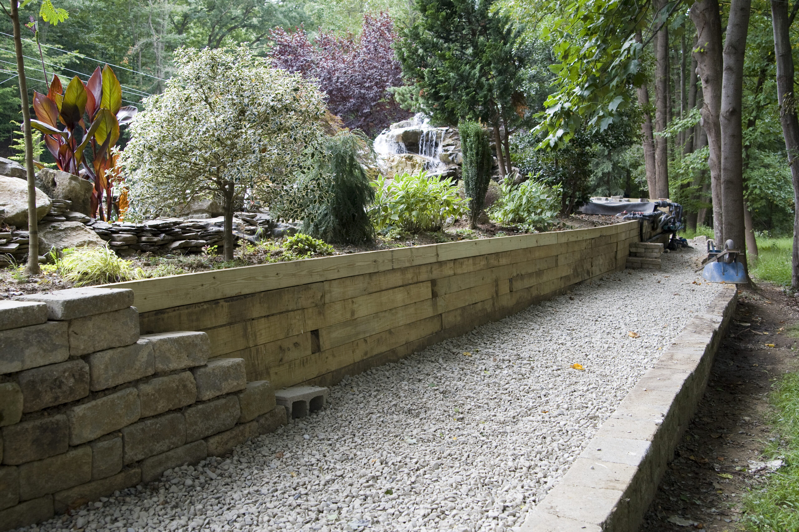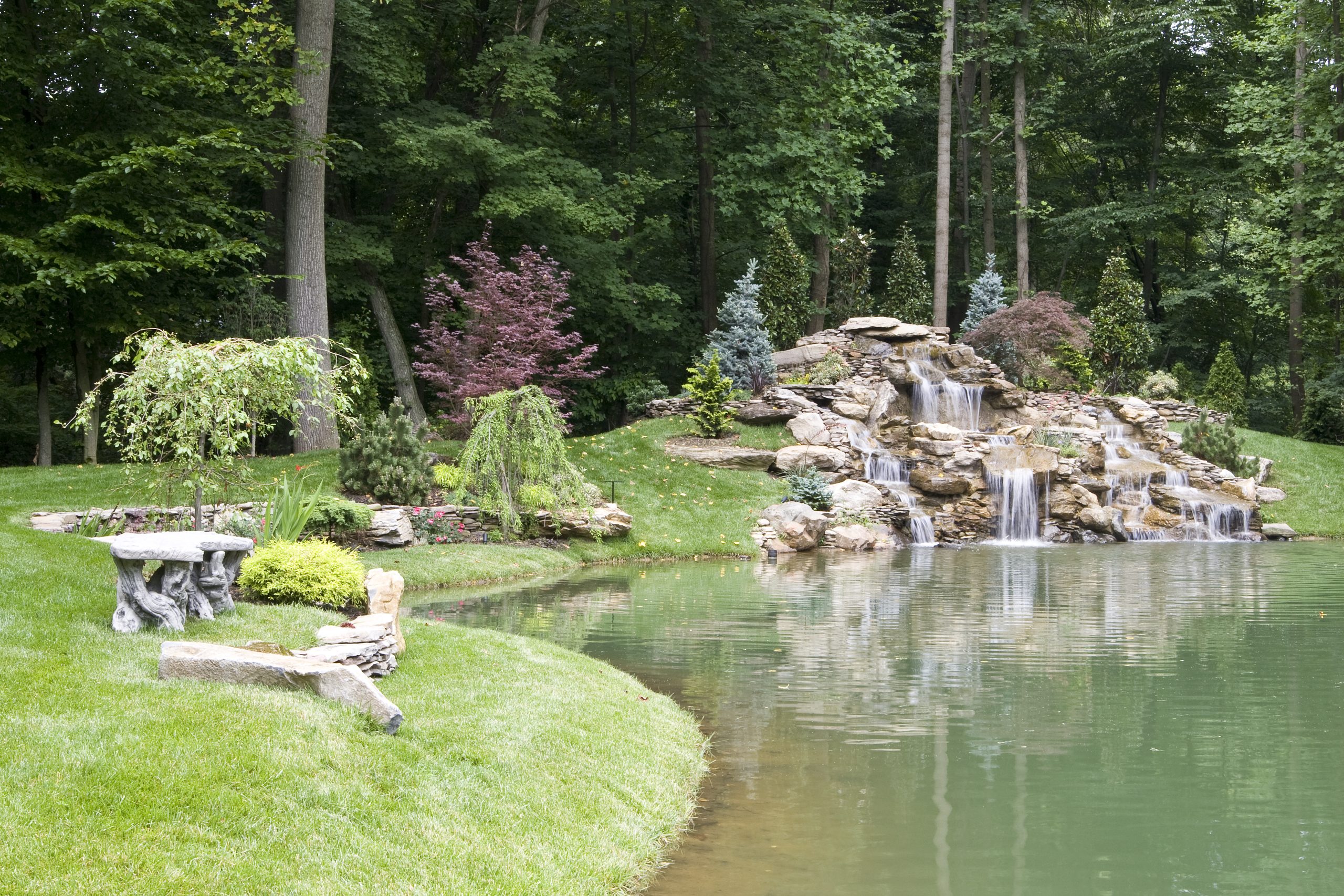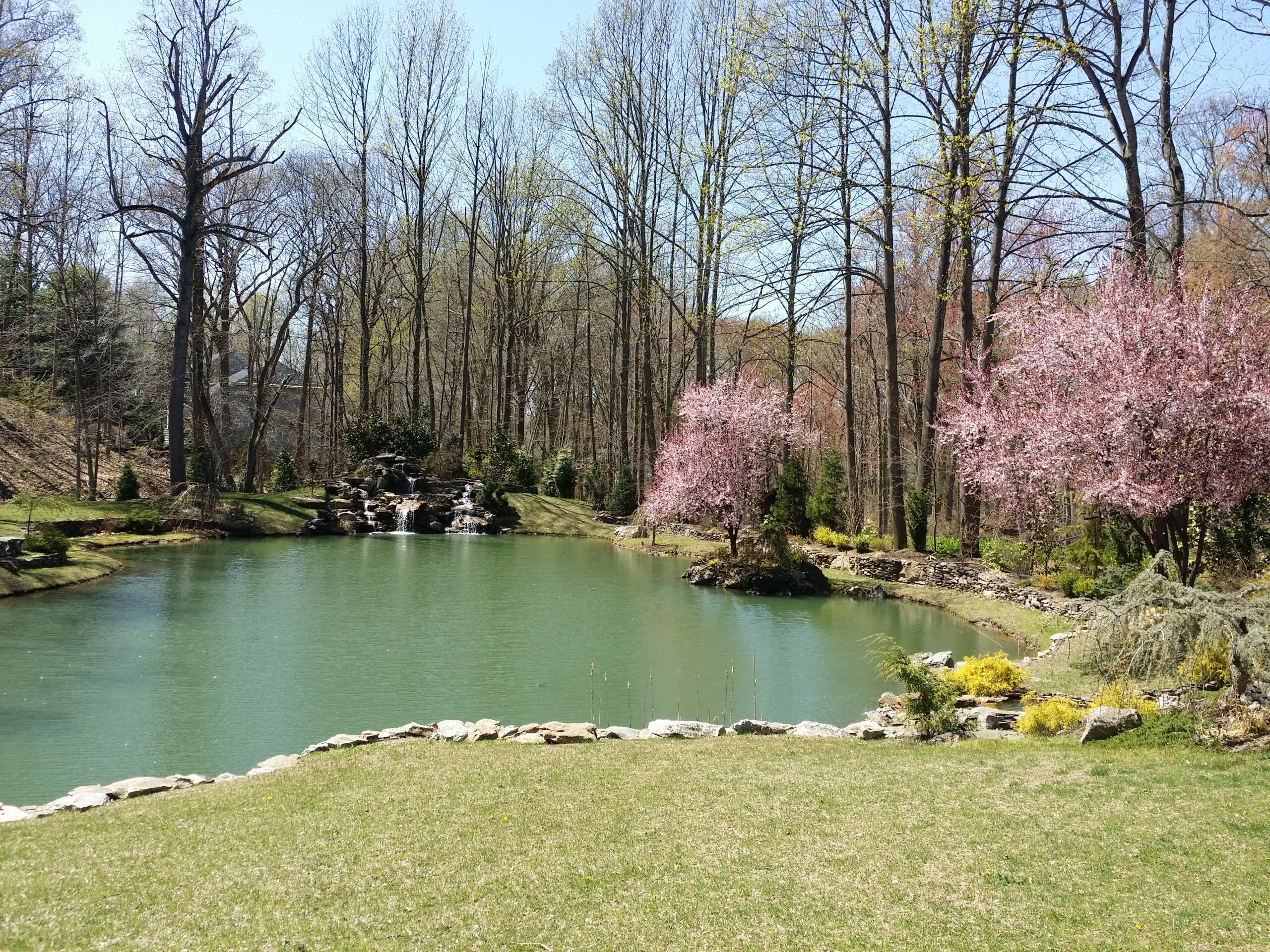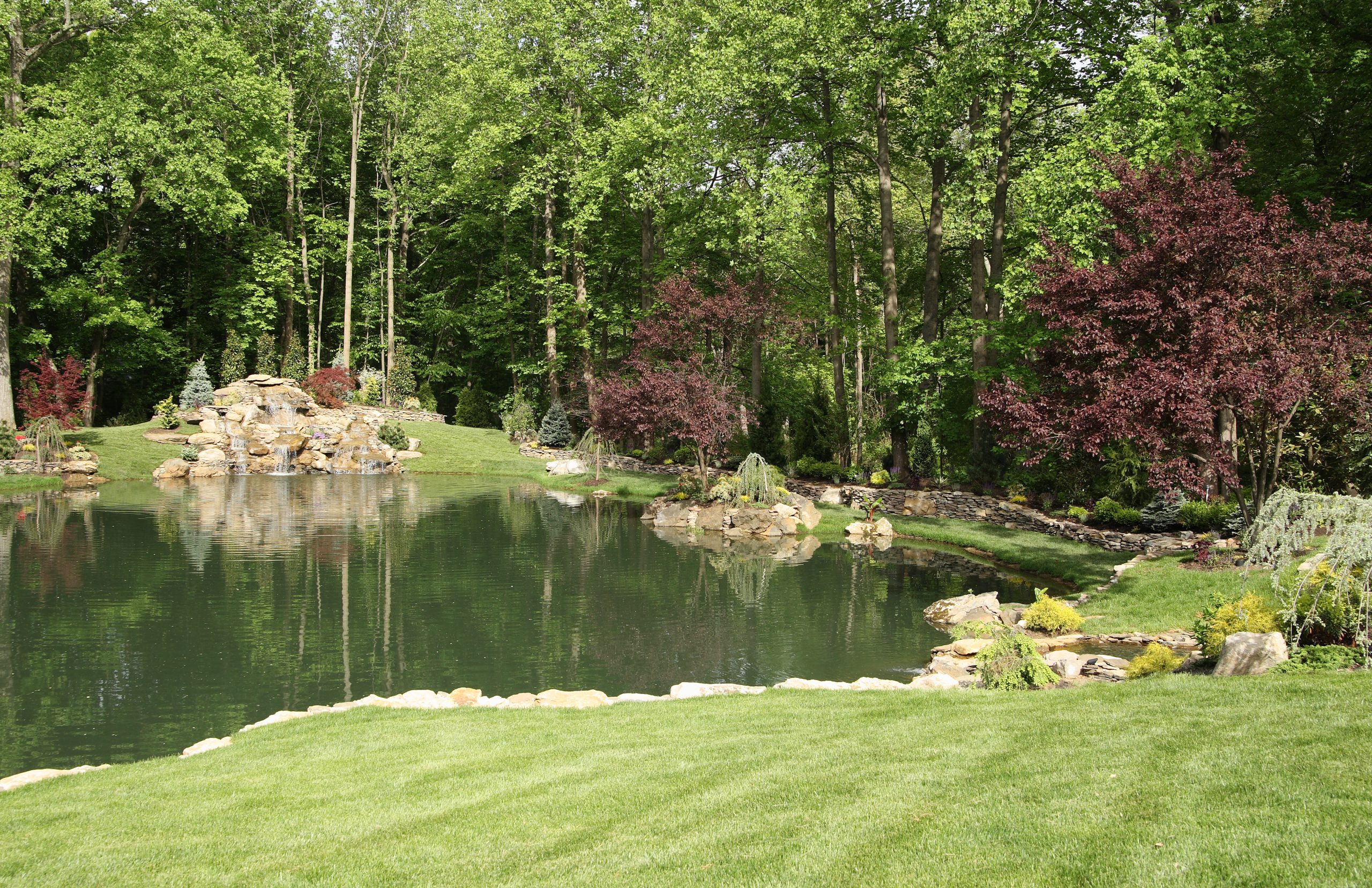 Along the left side of this photo, the side facing the lake, I built a retaining wall out of cement, moss rock and field stone. Turned it into a feeding area, built a stone staircase that leads to a bluestone bridge that crosses over the top of a waterfall that leads down to the natural pond.