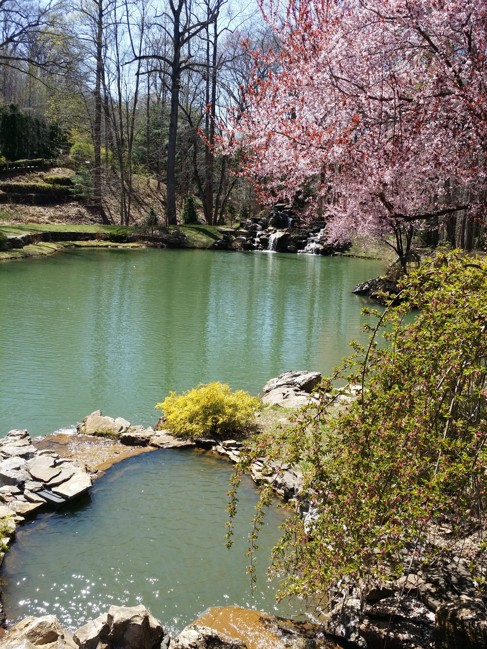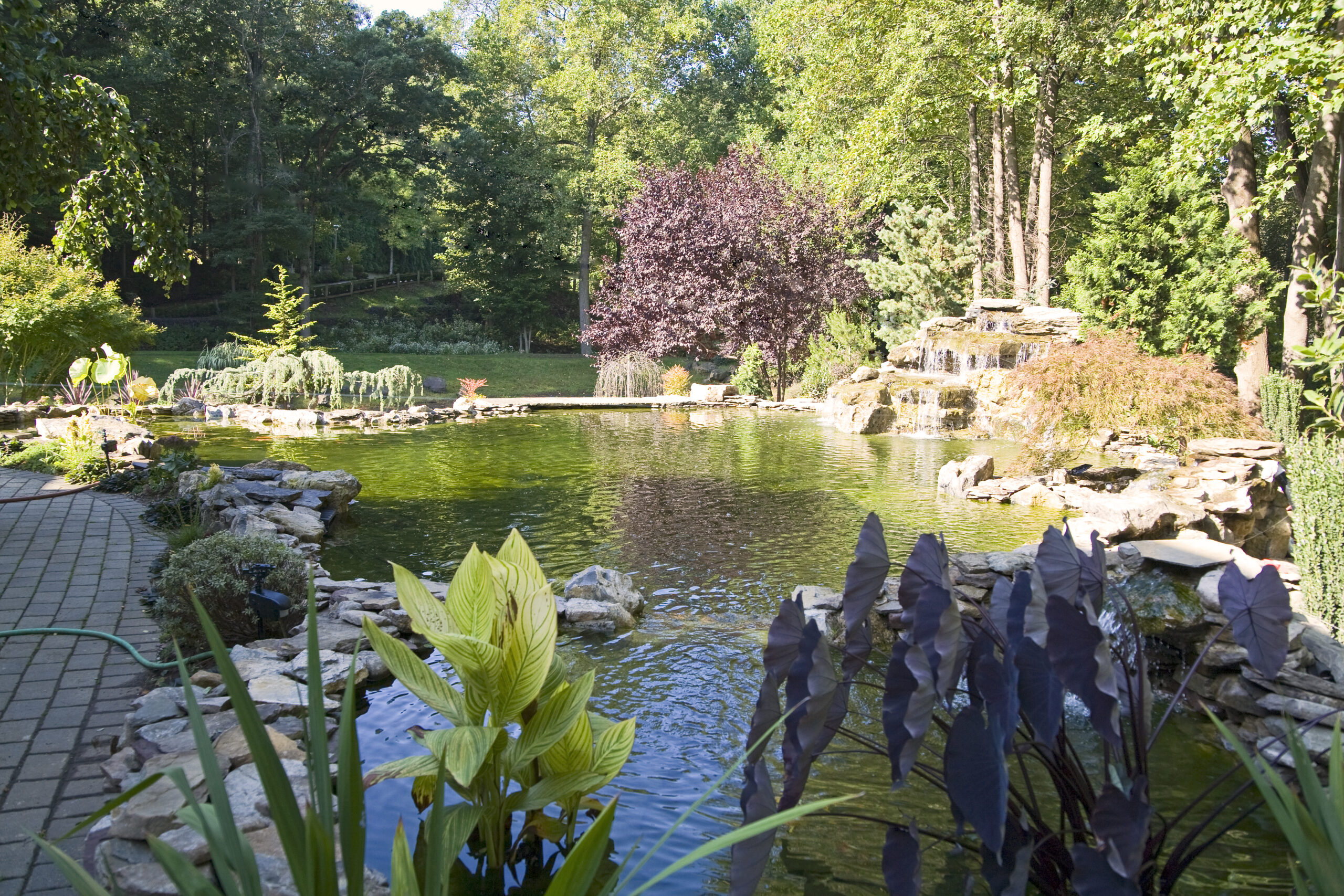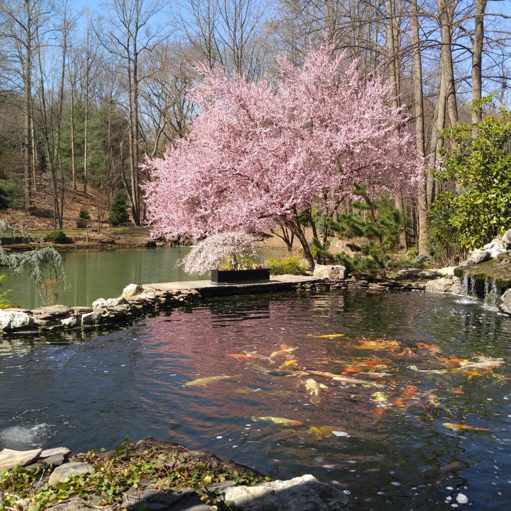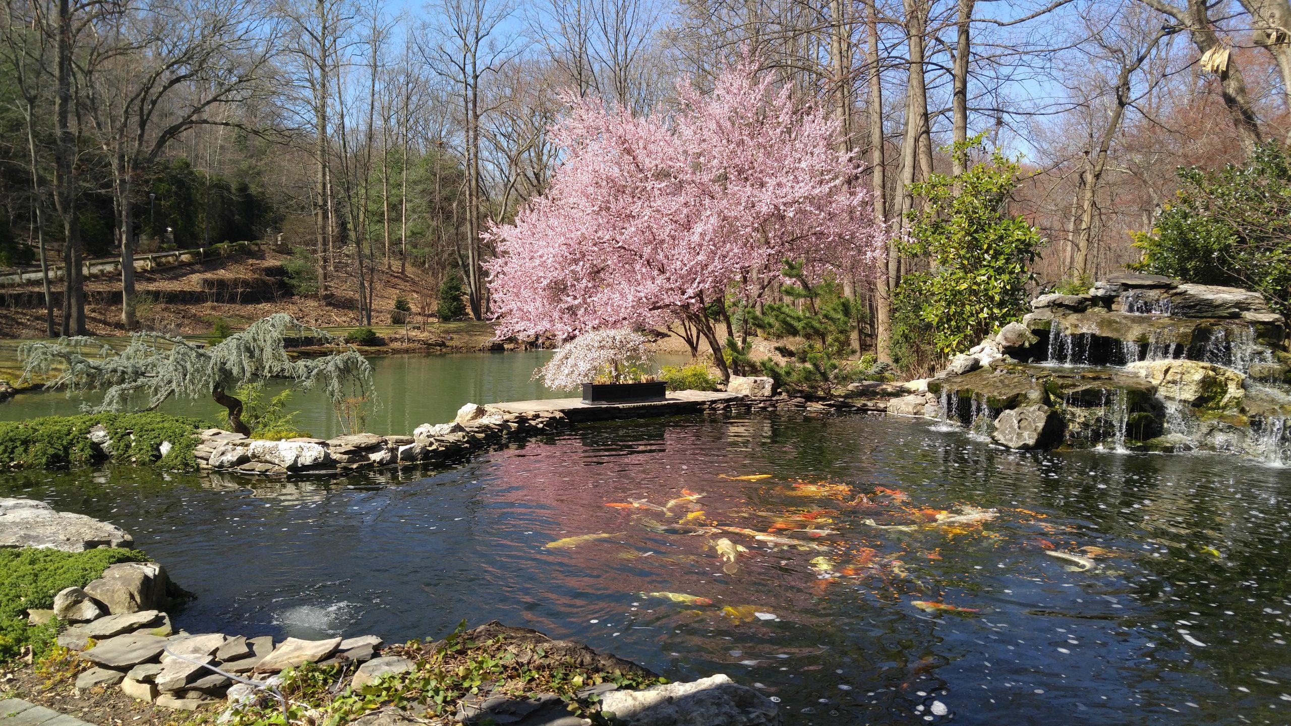 The waterfall appears to connect the koi pond to the lake. However, they are separate, divided under the bridge. This way the water from the koi pond does not mix with the water in the natural pond. This pond is home to about seventy five large koi.