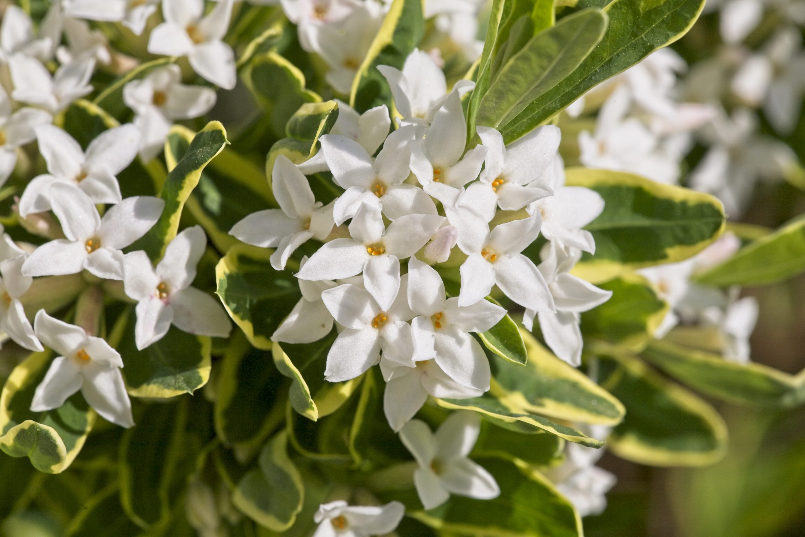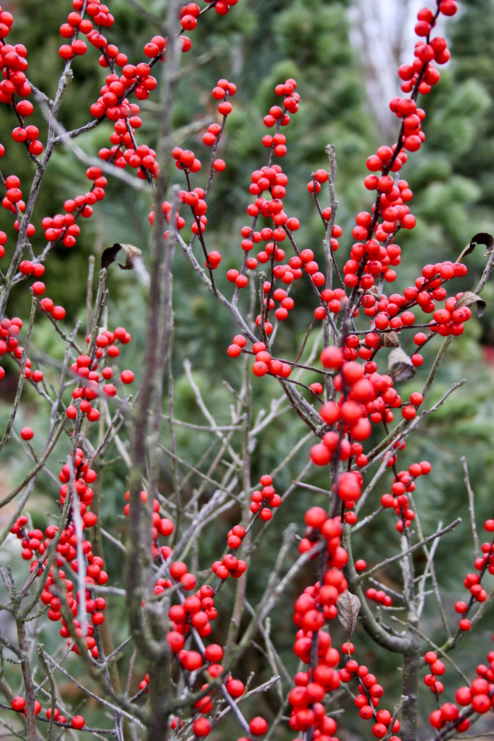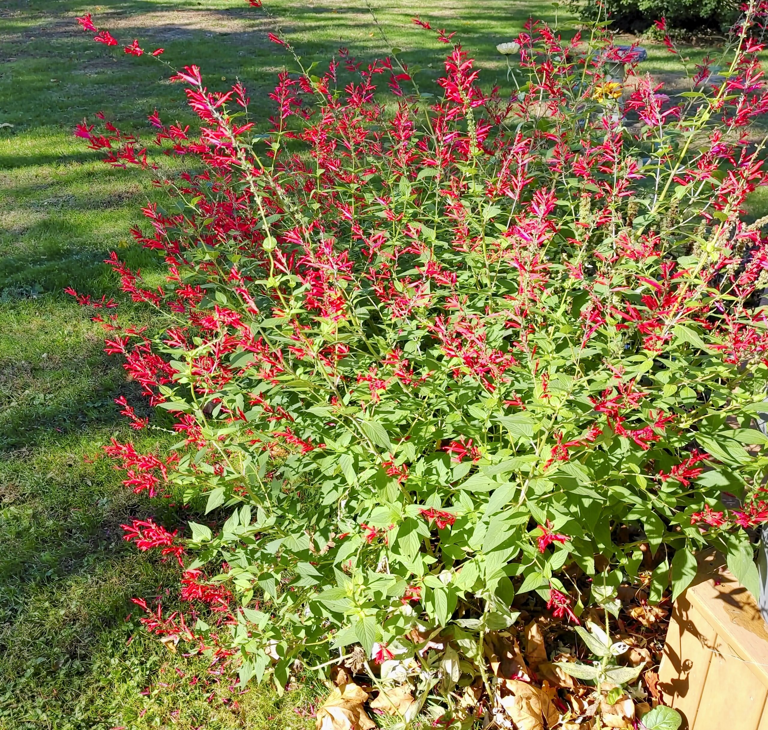 Nandina domestica….Heavenly bamboo. great plant for all year interest. Evergreen that has white flowers in the spring, red berries in the fall and a purple-red fall / winter color. Stays very compact about four feet tall. On the right is Witchhazel, with yellow or orange-red flowers in the late winter. Southern Magnolia… an evergreen with large white fragrant flowers in summer. Cryptomeria or japanese cedar, my favorite evergreen. They grow fast, stay very pyramidal, and get a nice orangey tint in the winter. Plus the deer do not touch them! A hummingbird favorite is this Rockin’ deep purple salvia. Winterberry is a type of holly without the spiny leaves. A large shrub that is often used for the Christmas holidays as decoration. An Oak-Leaf Hydrangea has large oak leaf shaped leaves and large white showy flowers in summer. Sensation lilac…variegated purple and white flowers that are surprisingly not fragrant, unlike many other lilacs. A ‘Carol Mackie’ daphne. Compact variegated leaves and extremely fragrant flowers. Like perfume! And finally Pineapple Sage. The bright red flowers cover this plant in the fall, and the leaves smell really sweet!